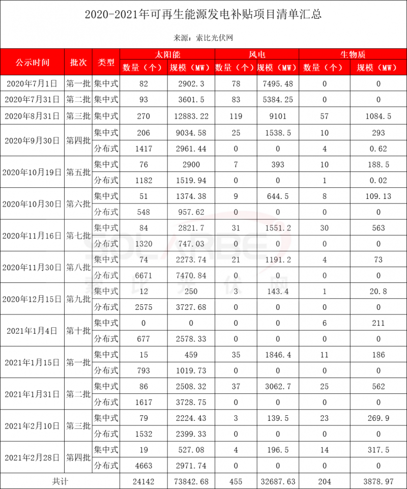據(jù)索比光伏網(wǎng)統(tǒng)計(jì),2020年至今,國家電網(wǎng)共公布十四批可再生能源補(bǔ)貼清單。其中,太陽能發(fā)電項(xiàng)目24142個,容量73.84GW;風(fēng)電項(xiàng)目455個,容量32.69GW;生物質(zhì)發(fā)電項(xiàng)目204個,容量3.88GW。