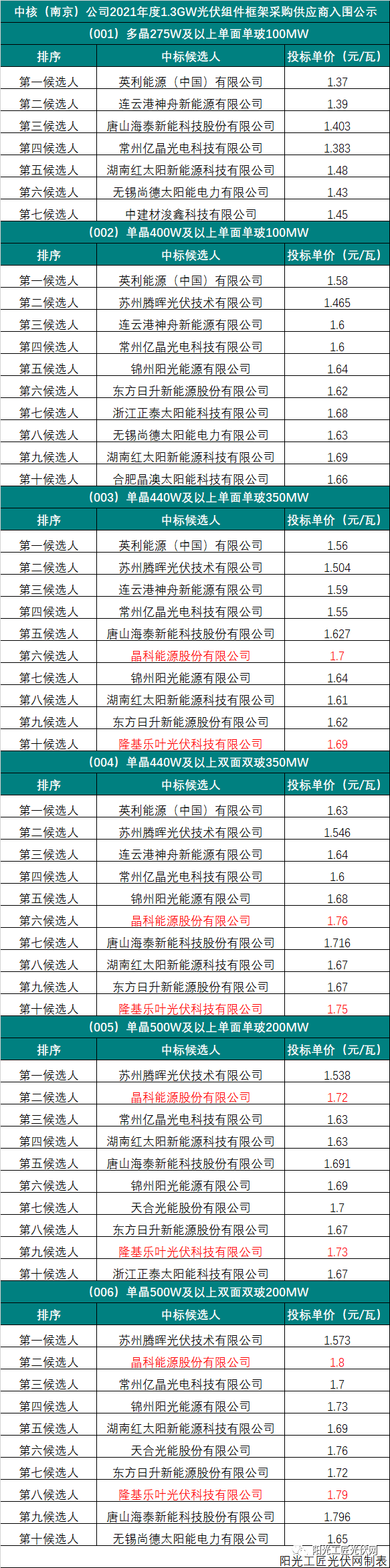 根據(jù)陽光工匠光伏網(wǎng)的統(tǒng)計,中核(南京)1.3GW組件集采的開標(biāo)結(jié)果如下表所示。