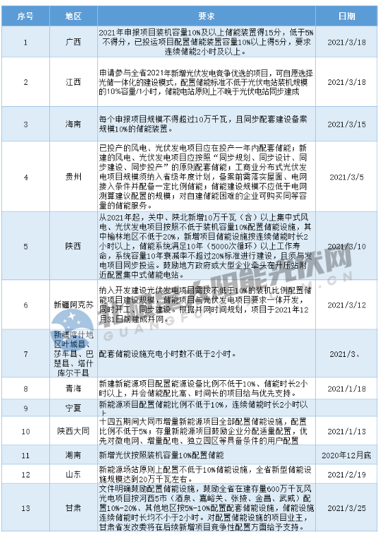 就消納掣肘,光伏電站配置儲(chǔ)能成為政策導(dǎo)向。據(jù)北極星太陽(yáng)能光伏網(wǎng)統(tǒng)計(jì),2021開年以來(lái),廣西、江西、貴州、山東、海南等13個(gè)地區(qū)要求風(fēng)、光項(xiàng)目強(qiáng)配儲(chǔ)能,比例在5%~10%之間,連續(xù)儲(chǔ)能在2小時(shí)及以上。然而在儲(chǔ)能經(jīng)濟(jì)性仍未達(dá)到預(yù)期且獲利商業(yè)模式仍未明朗下,強(qiáng)配儲(chǔ)能對(duì)于光伏電站投資業(yè)主來(lái)說(shuō)無(wú)疑是雪上加霜。