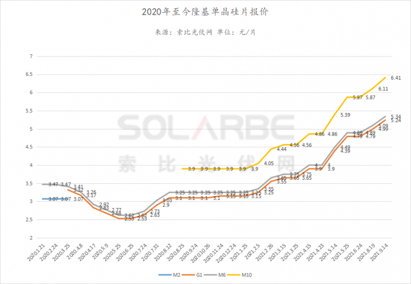 而隆基也在9月14日發(fā)布了新一期硅片價(jià)格公示。G1、M6、M10分別上漲0.25、0.25、0.3元/片,報(bào)價(jià)分別為5.24、5.34、6.41元/片。