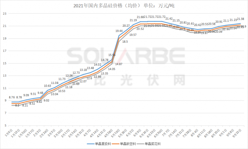 9月15日,硅業(yè)分會發(fā)布了本周國內(nèi)多晶硅成交價(jià)。其中單晶復(fù)投料價(jià)格區(qū)間在20.6-21.9萬元/噸,成交均價(jià)小幅上漲至21.38萬元/噸,周環(huán)比漲幅為0.71%;單晶致密料價(jià)格區(qū)間在20.4-21.7萬元/噸,成交均價(jià)上漲至21.15萬元/噸,周環(huán)比漲幅為0.62%。