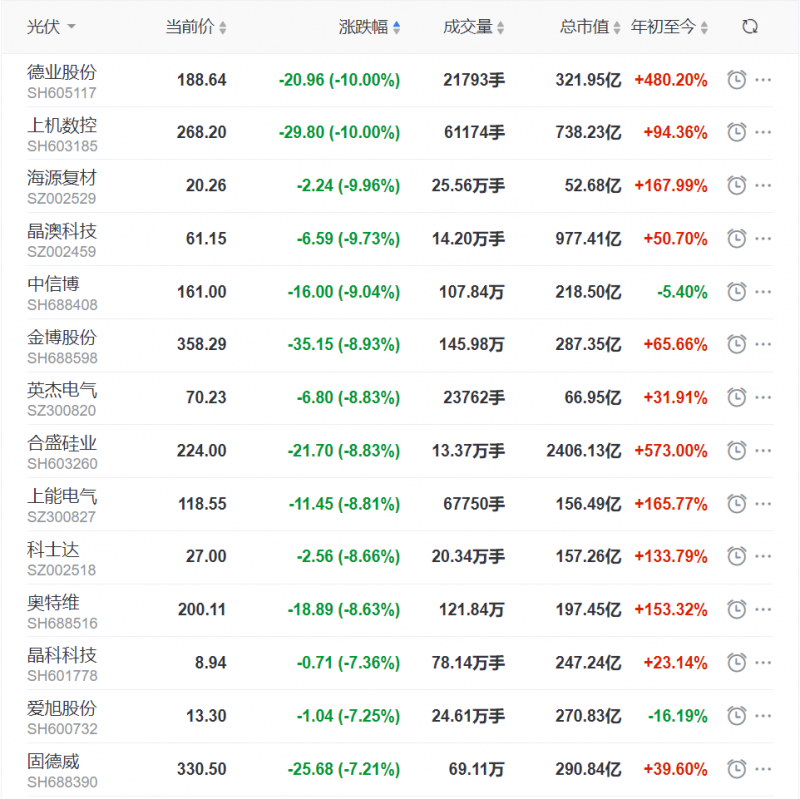 而近期掀起的又一波漲價(jià)潮,也最終反應(yīng)在資本市場。截止中午休盤時(shí)間,德業(yè)股份、上機(jī)數(shù)控主板跌停下跌10%、海源復(fù)材下跌9.96%、晶澳科技下跌9.73%、中信博下跌9.04%。