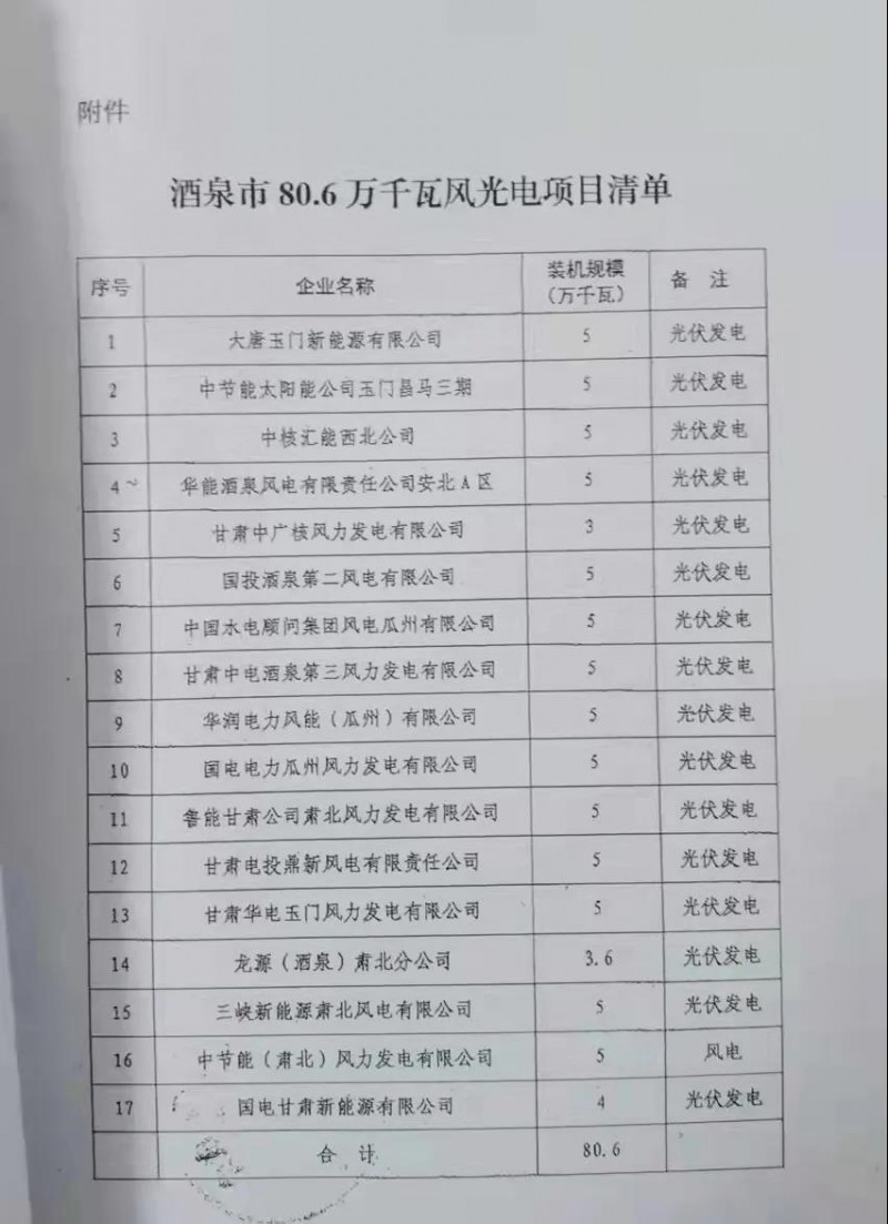 酒泉風(fēng)、光項目名單
