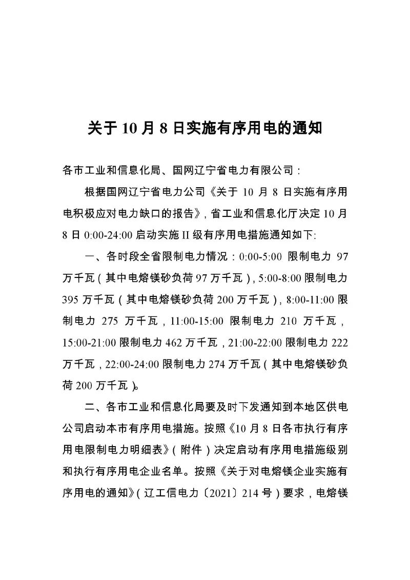 根據(jù)電力供需平衡預(yù)測(cè),10月8日遼寧省最大電力缺口為462萬千瓦,依據(jù)國家發(fā)改委《有序用電管理辦法》,為嚴(yán)重缺電II級(jí)橙色預(yù)警。決定10月8日0:00-5:00限制電力97萬千瓦,5:00-8:00限制電力395萬千瓦,8:00-11:00限制電力275萬千瓦,11:00-15:00限制電力210萬千瓦,15:00-21:00限制電力462萬千瓦,21:00-22:00限制電力222萬千瓦,22:00-24:00限制電力274萬千瓦。