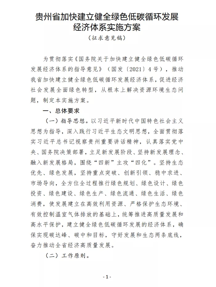 10月12日,貴州省發(fā)改委發(fā)布《貴州省加快建立健全綠色低碳循環(huán)發(fā)展經(jīng)濟體系實施方案(征求意見稿)》 公開征求意見。