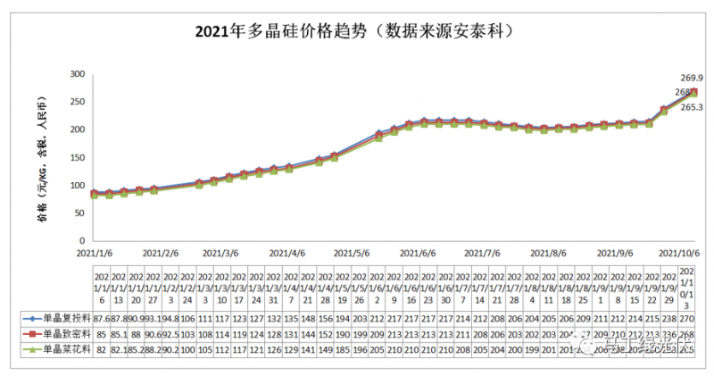 據(jù)安泰科的多晶硅價格公布,硅料已從年初87.6元/KG(單晶復(fù)投料)漲至現(xiàn)在的269.9元/KG,足足翻了3倍,而光伏組件的漲幅卻不足50%…