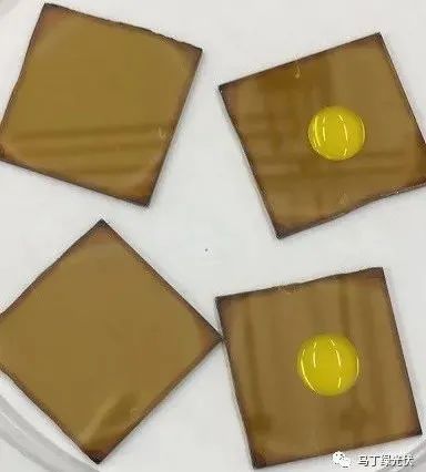 目前來看,鈣鈦礦材料對水汽或高溫較為敏感。直接暴露的高濕環(huán)境下,形成的鈣鈦礦結(jié)構(gòu)將會快速失效,變?yōu)榉氢}鈦礦結(jié)構(gòu),同時特有的棕褐色也會發(fā)生變化(如下圖,水滴滴在鈣鈦礦材料表面時,顏色發(fā)生了明顯的變化。所以,材料穩(wěn)定性與封裝的研究至關(guān)重要。在2021年初,杭州纖納重磅宣布了全球首個通過了基于IEC61215標(biāo)準(zhǔn)的加嚴(yán)穩(wěn)定性證書,邁出了鈣鈦礦組件商業(yè)化堅(jiān)實(shí)的一步。