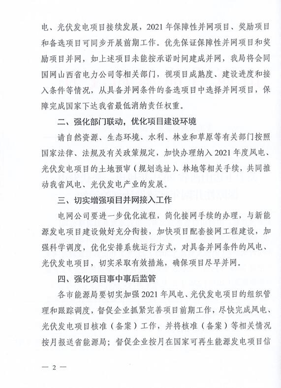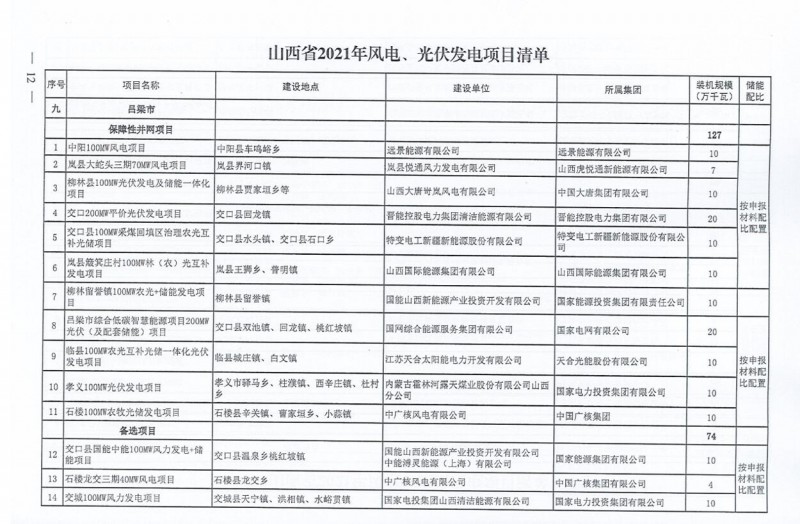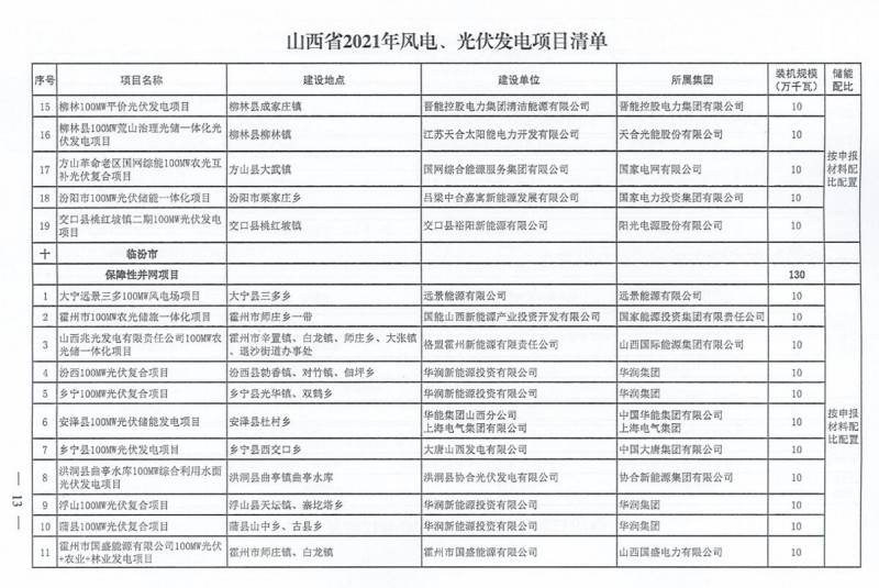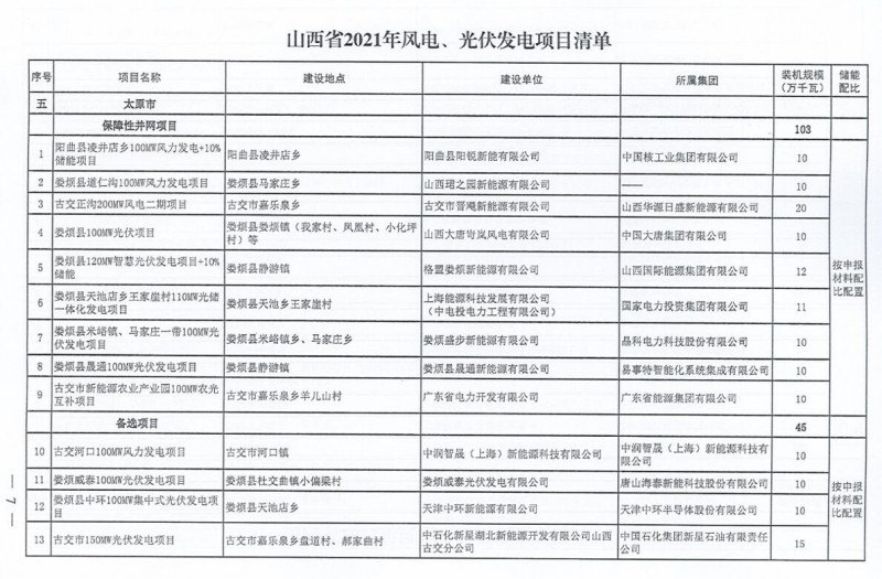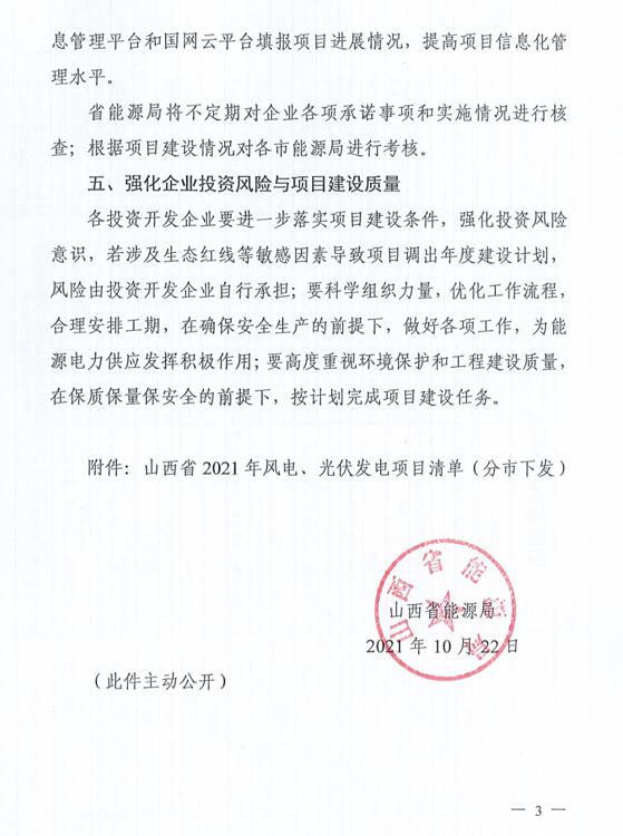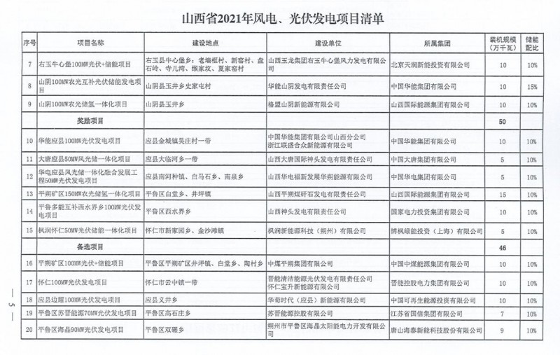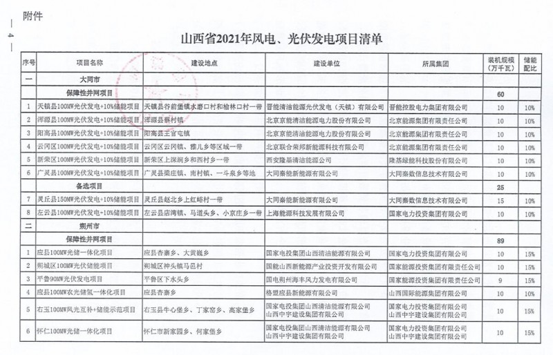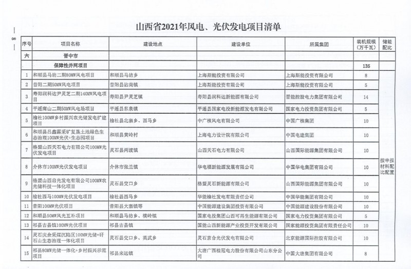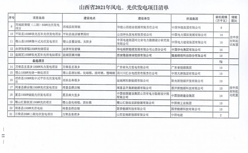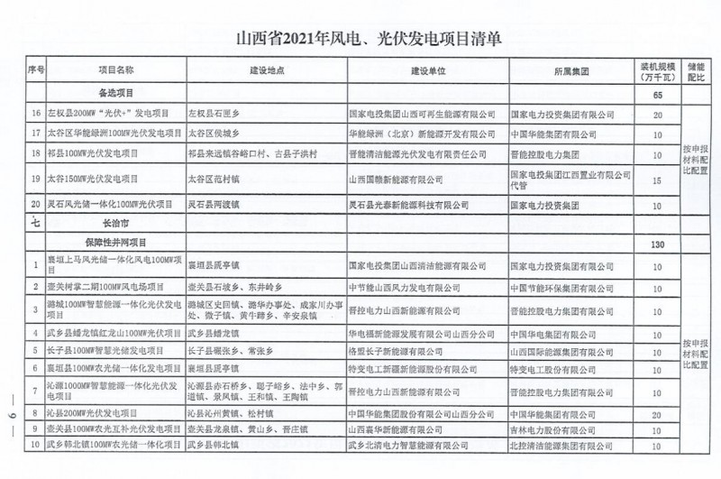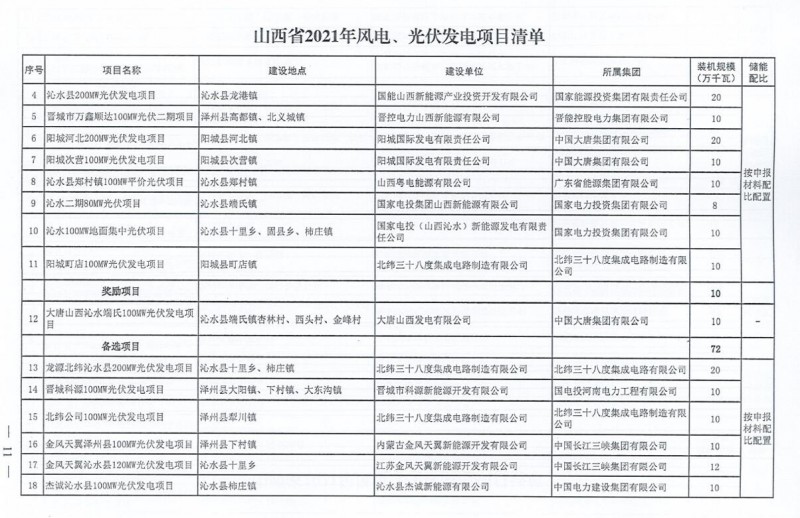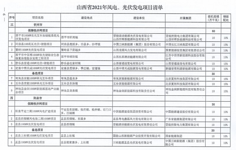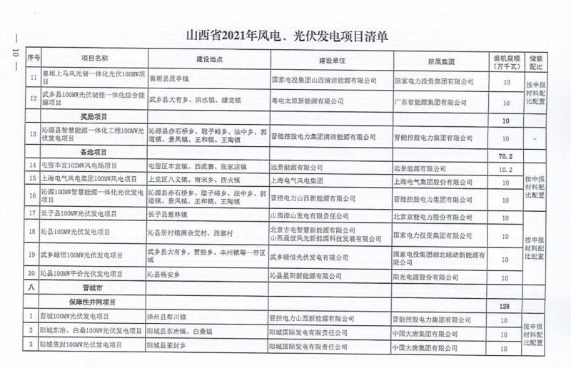 10月22日,山西省能源局下達(dá)2021年度風(fēng)電、光伏發(fā)電保障性并網(wǎng)年度建設(shè)計劃。風(fēng)、光合計17.792GW,其中保障性11.2GW+獎勵700MW+備選5.892GW。文件明確保障性規(guī)模與獎勵規(guī)模可同步開展前期工作,優(yōu)先保證保障性并網(wǎng)項(xiàng)目和獎勵項(xiàng)目并網(wǎng),如上述項(xiàng)目未能按承諾時間并網(wǎng),將視項(xiàng)目成熟度、建設(shè)進(jìn)度和接入條件等,從備選項(xiàng)目中選擇并網(wǎng)項(xiàng)目,保障完成國家下達(dá)的最低消納責(zé)任權(quán)重。