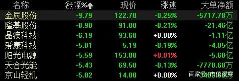 盤面顯示,金辰股份(603396)一度大跌10%,尾盤小幅拉升收跌9.79%,一日蒸發(fā)15.4億元。此外,陽光電源(300274)等6只概念股跌超5%。