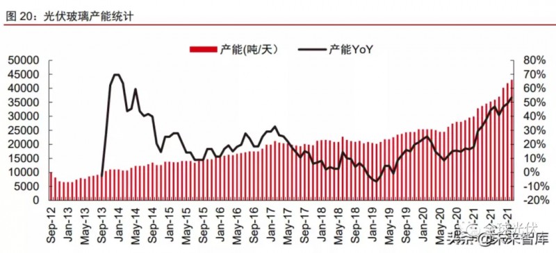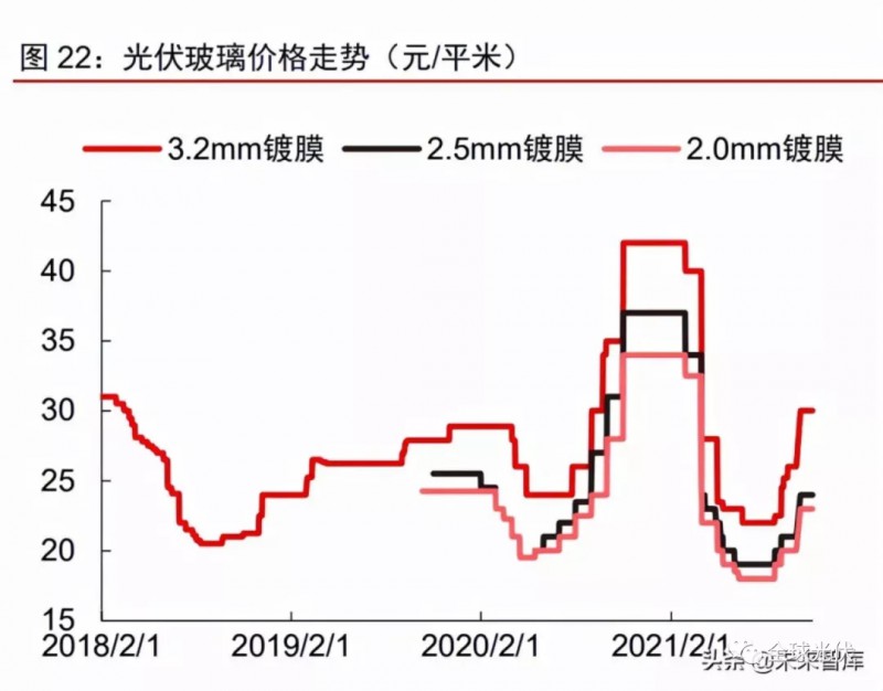 2021年光伏玻璃價(jià)格大幅回落,2022年價(jià)格或?qū)⒕S持中低位波動(dòng)。光伏玻璃供需格局的變化也反應(yīng)在企業(yè)庫(kù)存。據(jù)卓創(chuàng)資訊統(tǒng)計(jì),2021H1,隨著行業(yè)產(chǎn)能擴(kuò)張以及需求延后,光伏玻璃行業(yè)主流廠(chǎng)商庫(kù)存天數(shù)由年初10天以?xún)?nèi)快速增至40天左右;受此影響,光伏玻璃價(jià)格也于4月從高點(diǎn)出現(xiàn)“腰斬式”下跌。隨著Q3后庫(kù)存逐步消化回落,以及受純堿價(jià)格大幅上漲推動(dòng),光伏玻璃價(jià)格從底部開(kāi)始有所回升,目前3.2mm產(chǎn)品價(jià)格約30元/平米,2.0mm產(chǎn)品價(jià)格約23元/平米。展望2022年,我們認(rèn)為在原材料成本有望逐步回落,且行業(yè)供需格局總體保持寬松的情況下,光伏玻璃價(jià)格有望在中低水平整體保持穩(wěn)定,預(yù)計(jì)3.2mm和2.0mm玻璃價(jià)格或?qū)⒃?5元/平米和20元/平米的中樞附件波動(dòng)。