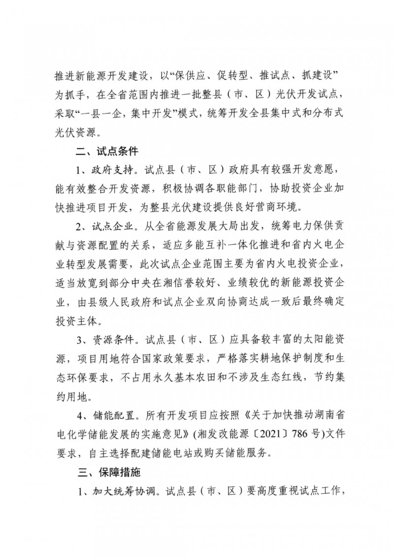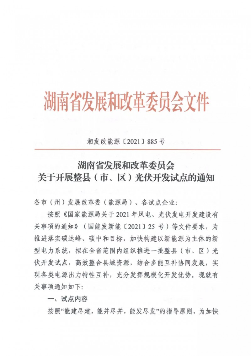11月15日,湖南省發(fā)改委下發(fā)《關(guān)于開展整縣(市、區(qū))光伏開發(fā)試點的通知》,擬在全省范圍內(nèi)組織推進一批整縣(市、區(qū))光伏開發(fā)試點,高效整合縣域資源,結(jié)合多能互補協(xié)同發(fā)展。