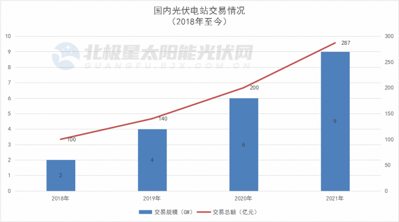 據(jù)北極星太陽能光伏網(wǎng)數(shù)據(jù)庫顯示,2018年至今,我國光伏電站交易規(guī)模正以2GW+/年速度攀升。2018年我國光伏電站交易規(guī)模在2GW以上,交易總額超100億元;2019年電站交易規(guī)模“翻倍”達到4.24GW,交易總額140多億元;2020年可統(tǒng)計的光伏電站總交易規(guī)模攀升至6.3GW,交易總額超過200億元。2021年初至今,可統(tǒng)計的光伏電站總交易規(guī)模已超9GW,交易總額287億元以上。