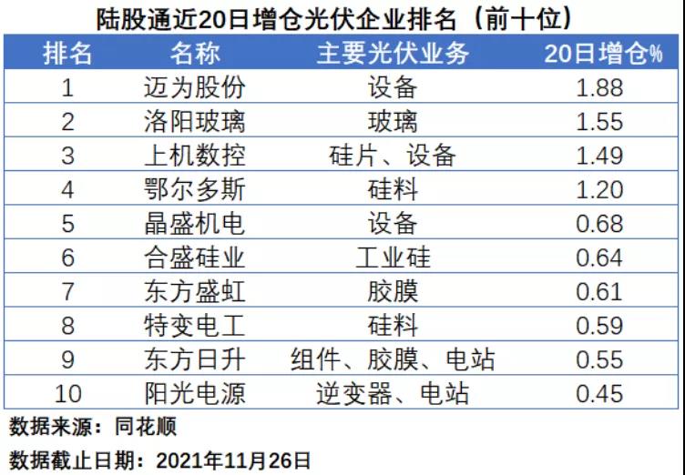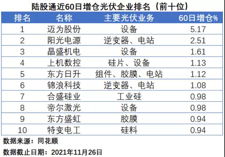 在陸股通近60日增倉排名中,邁為股份、陽光電源和晶盛機電分居前三位,增倉幅度分別為5.17%、2.51%和1.61%,其中邁為股份和晶盛機電均為光伏設備企業(yè),前者的核心產品為太陽能電池絲網印刷生產設備,后者主營產品為晶體生長設備。上機數控、東方日升、錦浪科技、合盛硅業(yè)、帝爾激光、東方盛虹和特變電工分居第四到第十位。前十名中,涉足光伏設備業(yè)務的企業(yè)高達4家,涉足電站業(yè)務的企業(yè)為3家。
