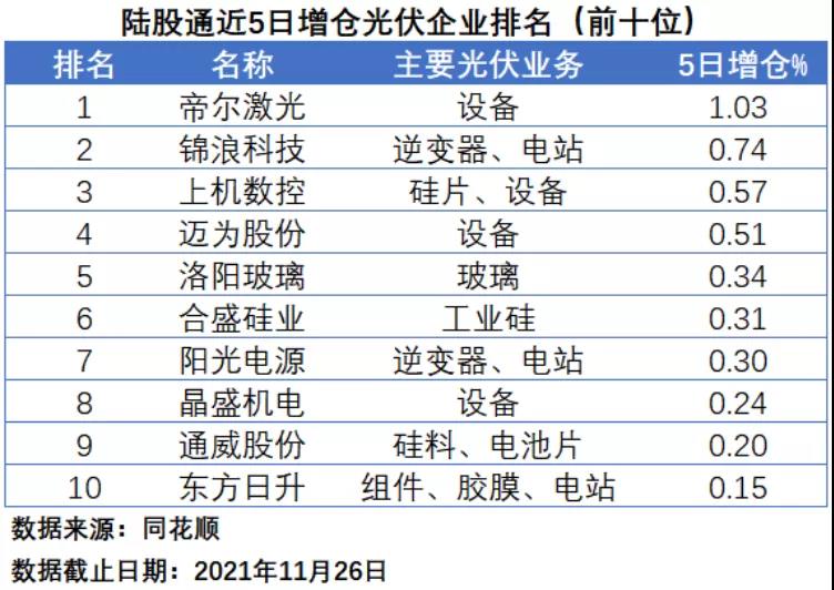 在陸股通近5日增倉排名中,電池片生產設備廠商帝爾激光最受“北向資金”追捧,以1.03%的增持幅度排名第一,錦浪科技、上機數控以0.74%和0.57%位居第二和第三,邁為股份、洛陽玻璃、合盛硅業(yè)、陽光電源、晶盛機電、通威股份和東方日升位居第四到第十位。前十名中,涉足光伏設備領域的企業(yè)數量依然為最多,達到了4家。