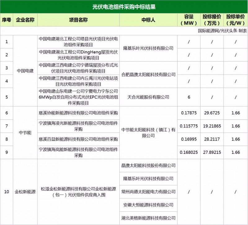 近日,中國電建、中節(jié)能、金松新能源發(fā)布光伏電池組件、光伏逆變器、光伏支架等項(xiàng)目中標(biāo)結(jié)果公告。規(guī)模合計為212.6325MW。
