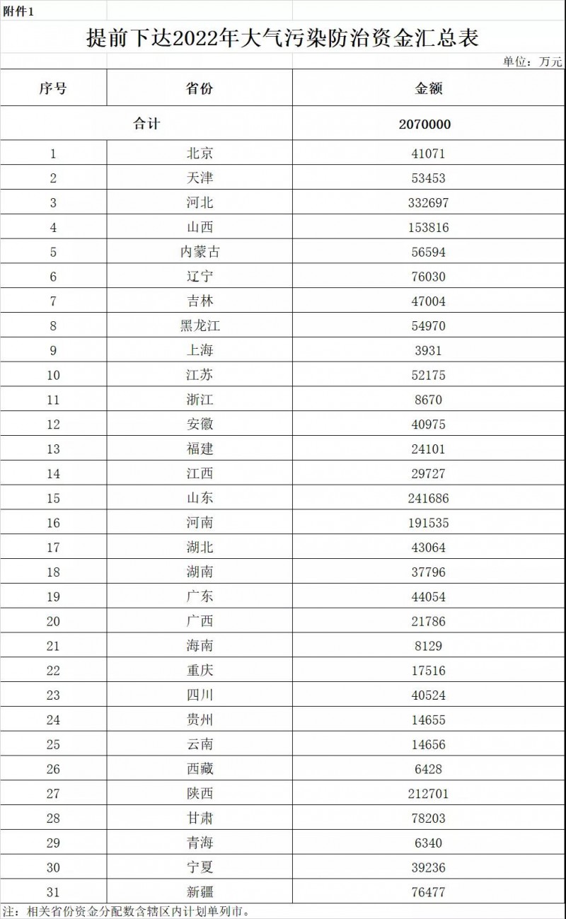 近日,財政部提前向31個省、自治區(qū)、直轄市財政廳(局)下達(dá)207億元大氣污染防治資金,用于支持開展減污降碳等方面相關(guān)工作。其中,下達(dá)我區(qū)2022年大氣污染防治資金5.6594億元。