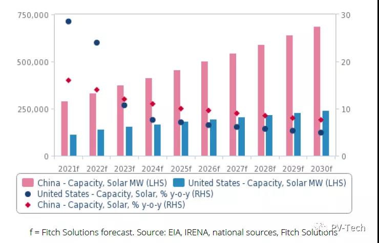 至2030年,美國(guó)和中國(guó)分別會(huì)增加151.3GW和436.9GW太陽(yáng)能裝機(jī)容量,占太陽(yáng)能預(yù)期新增總量的57%。