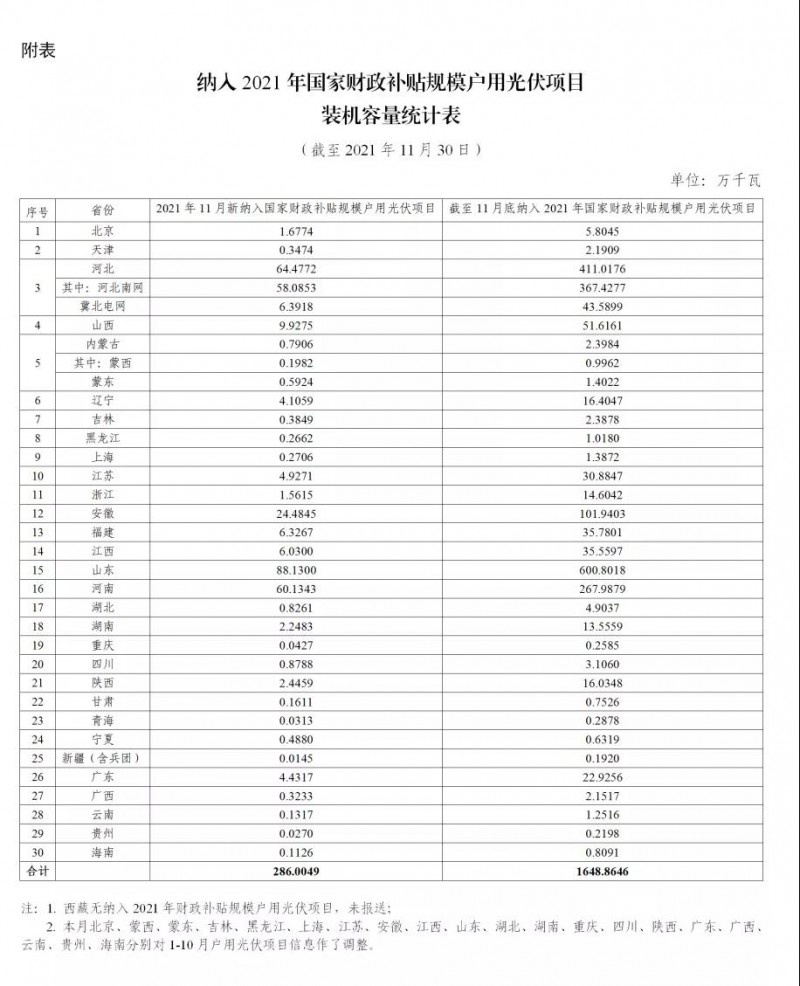 根據(jù)各省級(jí)能源主管部門、電網(wǎng)企業(yè)報(bào)送信息,經(jīng)國家可再生能源信息管理中心梳理統(tǒng)計(jì),2021年11月新納入國家財(cái)政補(bǔ)貼規(guī)模戶用光伏項(xiàng)目總裝機(jī)容量為286萬千瓦。截至2021年11月底,全國累計(jì)納入2021年國家財(cái)政補(bǔ)貼規(guī)模戶用光伏項(xiàng)目裝機(jī)容量為1648.86萬千瓦。詳細(xì)情況見附表。