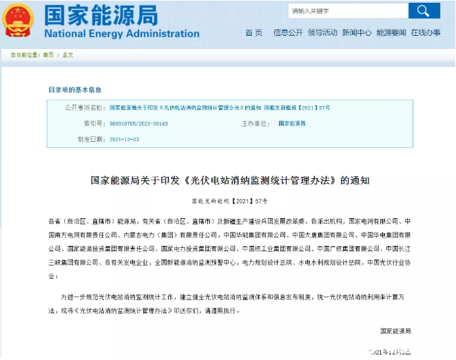 12月20日,國家能源局發(fā)布關于印發(fā)《光伏電站消納監(jiān)測統計管理辦法》的通知。