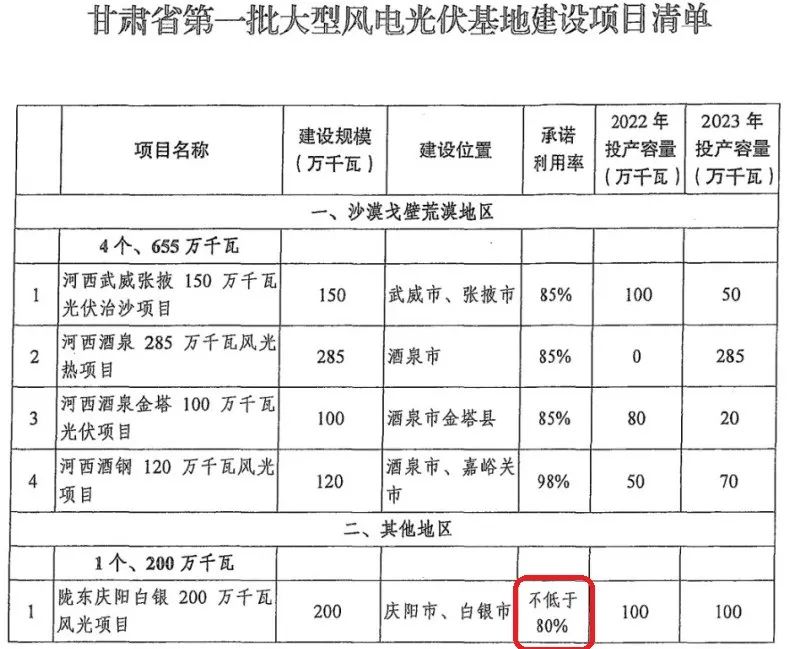 在國(guó)家能源局、國(guó)家發(fā)改委印發(fā)的《第一批以沙漠、戈壁、荒漠地區(qū)為重點(diǎn)的大型風(fēng)電、光伏基地建設(shè)項(xiàng)目清單的通知》中,青海省僅僅給出了84%的利用率承諾;而甘肅的一個(gè)基地,甚至只敢承諾80%!