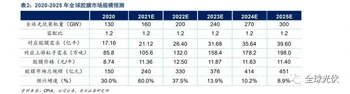 預(yù)計,2021-2023年全球光伏膠膜需求約為21.1、26.4和31.7億平方米,同比增長23%、25%和20%。到2025年,全球膠膜市場或達(dá)452億元規(guī)模,復(fù)合增速為17%。