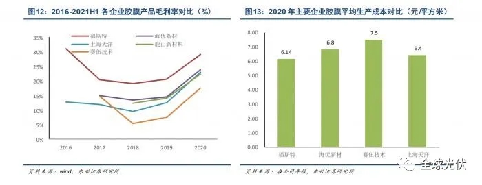 東興證券認(rèn)為,上游粒子廠商陸續(xù)投產(chǎn),光伏級粒子供給瓶頸將得到緩解,2021年原料成本端大幅上漲的壓力大概率不會延續(xù)到2022年,光伏膠膜成本有望得到進(jìn)一步控制和降低。與此同時,受益光伏裝機(jī)需求增長,預(yù)計膠膜售價有望持續(xù)堅挺。對于相關(guān)標(biāo)的來說,相較2021年,今年膠膜生產(chǎn)企業(yè)將會展現(xiàn)成本優(yōu)勢,毛利率有望大幅上漲。綜合來看,膠膜行業(yè)議價能力和盈利能力都將有提升和改善。