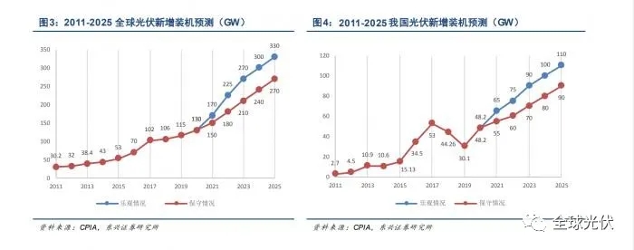 目前,全球已有130多個國家和地區(qū)相繼宣布碳中和目標(biāo),在全球提升可再生能源消費(fèi)比重的大背景下,全球新增風(fēng)光裝機(jī)將持續(xù)快速增長。根據(jù)光伏年度大會理事長王勃華預(yù)期,預(yù)計2021年全球光伏新增裝機(jī)量為150-170GW,并在未來幾年繼續(xù)保持年均30-40GW的增長,預(yù)計2025年新增全球裝機(jī)量將達(dá)270-330GW,新增裝機(jī)復(fù)合增速約17%。