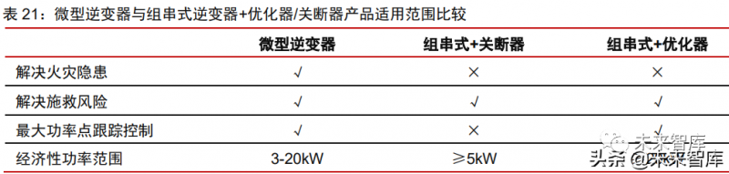 微型逆變器是小型、組件級分布式發(fā)電系統(tǒng)電能轉(zhuǎn)換的最佳方案。“組件級電力電子” 解決方案除了包括微型逆變器,還有“組串式逆變器+優(yōu)化器/關(guān)斷器”的方案。優(yōu)化器或 關(guān)斷器可為光伏系統(tǒng)提供組件級的關(guān)斷能力,在特定場景下保證光伏系統(tǒng)直流電壓不超過 80V,且優(yōu)化器亦可實現(xiàn)組件級的最大功率點跟蹤控制;但在運行過程中系統(tǒng)仍存在直流 高壓,有一定的安全隱患。組串式逆變器+優(yōu)化器/關(guān)斷器在較大功率的應(yīng)用場景中有一定 的成本優(yōu)勢,但微型逆變器在中小功率等級的應(yīng)用場景中更優(yōu)。