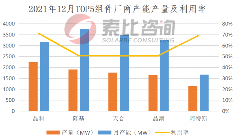 2021年12月,終端需求小幅上升,因此本月組件產(chǎn)量比上月也有小幅上漲。國內(nèi)組件產(chǎn)量16GW,環(huán)比增長2.23%。按照產(chǎn)量排名,晶科、隆基、天合、晶澳、阿特斯位列前五,企業(yè)總產(chǎn)量8.72GW,占比54.5%,綜合開工率58.41%。預(yù)計2022年1月,終端需求持續(xù)回暖,國內(nèi)2022年各企業(yè)集采招標(biāo)已陸續(xù)啟動,組件需求及價格都將小幅上漲。