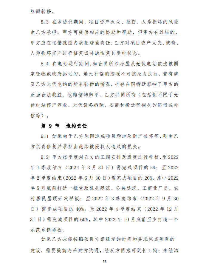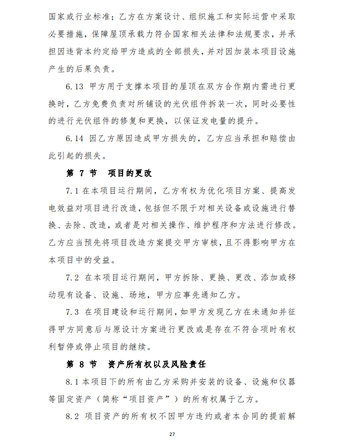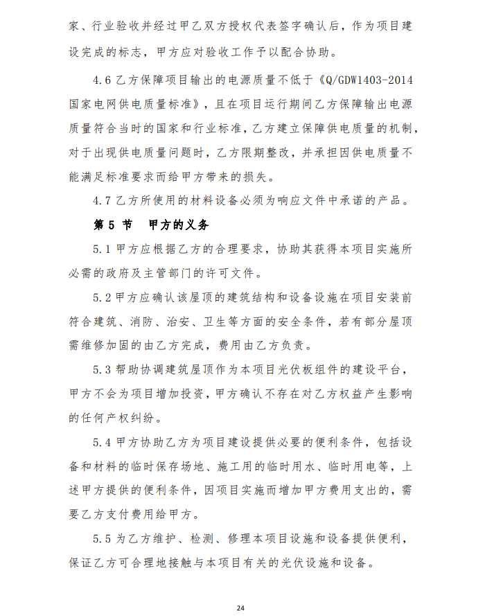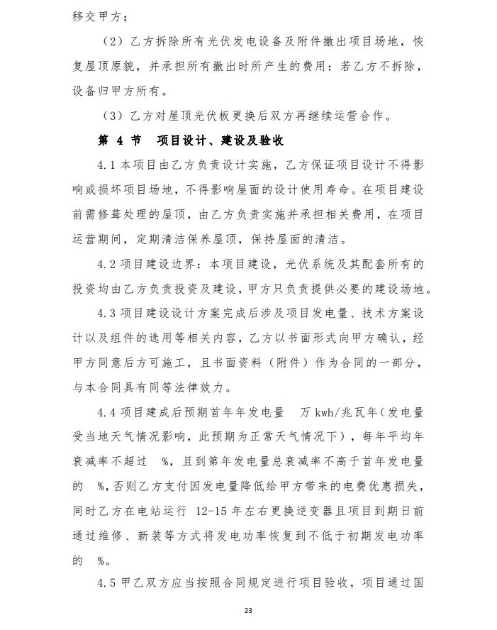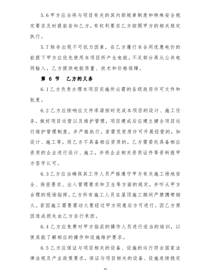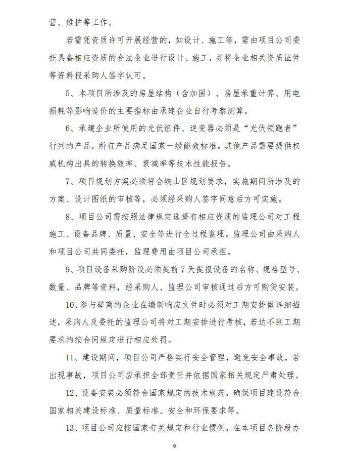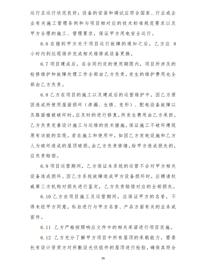 4、由于光伏發(fā)電項(xiàng)目運(yùn)行生命周期長,安裝用戶點(diǎn)多,面大,為保障安裝戶的權(quán)益,維護(hù)社會穩(wěn)定,建設(shè)企業(yè)要提供明確的長期運(yùn)維方案及保障費(fèi)用,具體以運(yùn)維合同為準(zhǔn)。