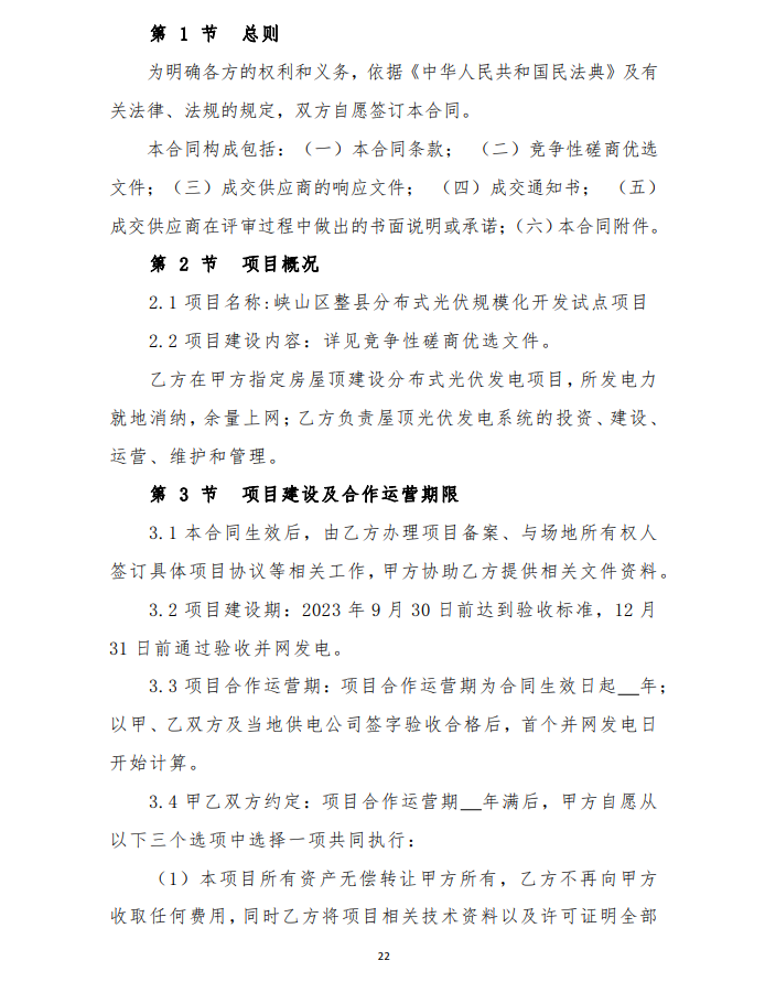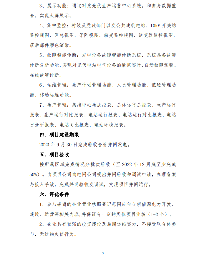 2月9日,山東濰坊峽山區(qū)發(fā)布整縣分布式光伏規(guī)?;_發(fā)試點(diǎn)項(xiàng)目競爭性磋商二次公告,要求2023 年 9 月 30 日完成驗(yàn)收合格并網(wǎng)發(fā)電,按所屬區(qū)域完成情況分批次驗(yàn)收(至 2022 年 12 月底至少完成50%)。由項(xiàng)目公司向電網(wǎng)公司提出并網(wǎng)驗(yàn)收和調(diào)試申請,辦理備案與接入手續(xù),完成并網(wǎng)驗(yàn)收及調(diào)試,實(shí)現(xiàn)項(xiàng)目并網(wǎng)運(yùn)行。至 2023 年底,光伏項(xiàng)目總投資約 4.0946 億元人民幣。