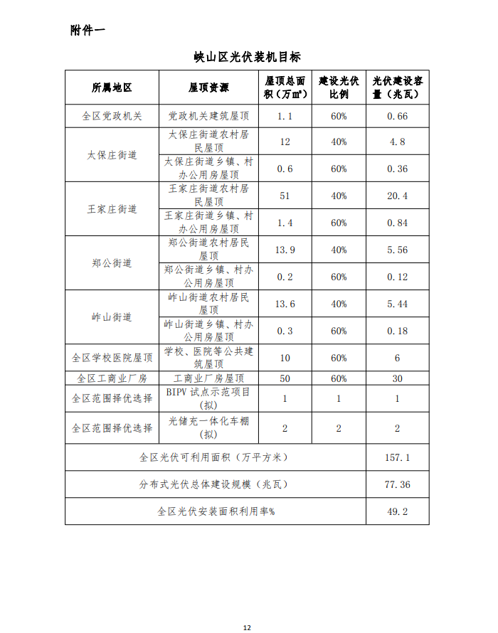 為深入貫徹落實(shí)鄉(xiāng)村振興戰(zhàn)略,努力實(shí)現(xiàn)國家碳達(dá)峰、碳中和戰(zhàn)略任務(wù),統(tǒng)籌推進(jìn)“源網(wǎng)荷儲-智慧協(xié)同”的分布式光伏建設(shè),打造全國“雙碳”示范區(qū),根據(jù)峽山區(qū)本地光照條件和屋頂資源情況,結(jié)合國家能源局政策要求,峽山區(qū)將利用全區(qū)黨政機(jī)關(guān)屋頂 1.1 萬平方米,全區(qū)學(xué)校、醫(yī)院等公共建筑屋頂 6 萬平方米,全區(qū)工商業(yè)廠房屋頂 30 萬平方米,全區(qū)農(nóng)村居民屋頂36.2 萬平方米,全區(qū)鄉(xiāng)鎮(zhèn)、村辦公用房屋頂 1.5 萬平方米,全區(qū)范圍內(nèi)擇優(yōu)擬建 BIPV 項(xiàng)目面積 1 萬平方米,全區(qū)擬建光儲充一體化車棚面積 2 萬平方米,實(shí)現(xiàn)分布式光伏新增裝機(jī) 77.36 兆瓦。