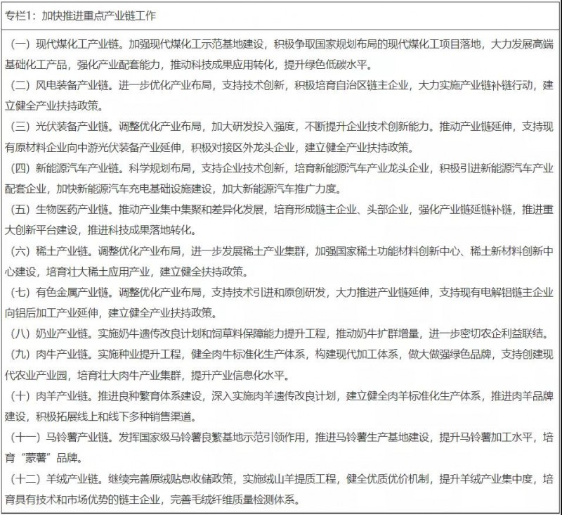 2月9日,內(nèi)蒙古自治區(qū)人民政府發(fā)布了《關于下達2022年內(nèi)蒙古自治區(qū)國民經(jīng)濟和社會發(fā)展計劃的通知》。通知提出,加快推進光伏裝備產(chǎn)業(yè)鏈等重點產(chǎn)業(yè)鏈工作,包括調(diào)整優(yōu)化產(chǎn)業(yè)布局,加大研發(fā)投入強度,不斷提升企業(yè)技術創(chuàng)新能力;推動產(chǎn)業(yè)鏈延伸,支持現(xiàn)有原材料企業(yè)向中游光伏裝備產(chǎn)業(yè)延伸,積極對接區(qū)外龍頭企業(yè),建立健全產(chǎn)業(yè)扶持政策。