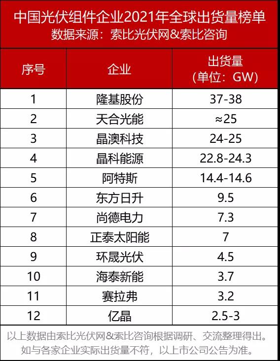從索比光伏網(wǎng)&索比咨詢(xún)發(fā)布的《中國(guó)光伏組件企業(yè)2021年全球出貨量榜單》看,隆基股份、天合光能、晶澳科技、晶科能源、阿特斯、東方日升、尚德電力、正泰太陽(yáng)能、環(huán)晟光伏、海泰新能、賽拉弗、億晶光電等企業(yè)名列前茅,出貨量合計(jì)約140GW,占全球組件總需求的75%以上。無(wú)論在國(guó)內(nèi)還是海外市場(chǎng),他們都斬獲頗豐。