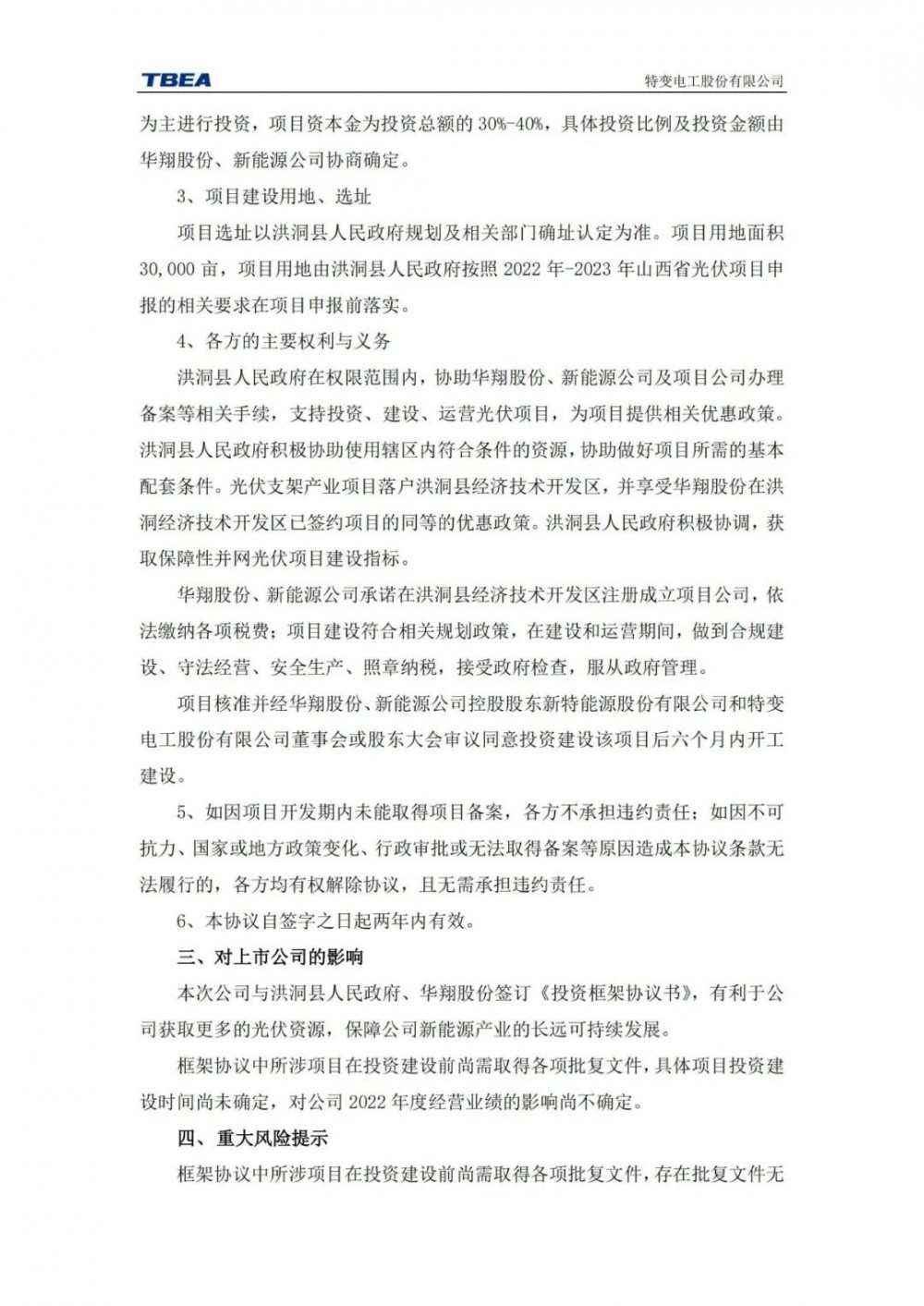 特變電工新疆新能源股份有限公司與洪洞縣人民政府、華翔股份在山西省臨汾市洪洞縣簽署了《1GW 光伏發(fā)電及配套項(xiàng)目投資框架協(xié)議書》。
