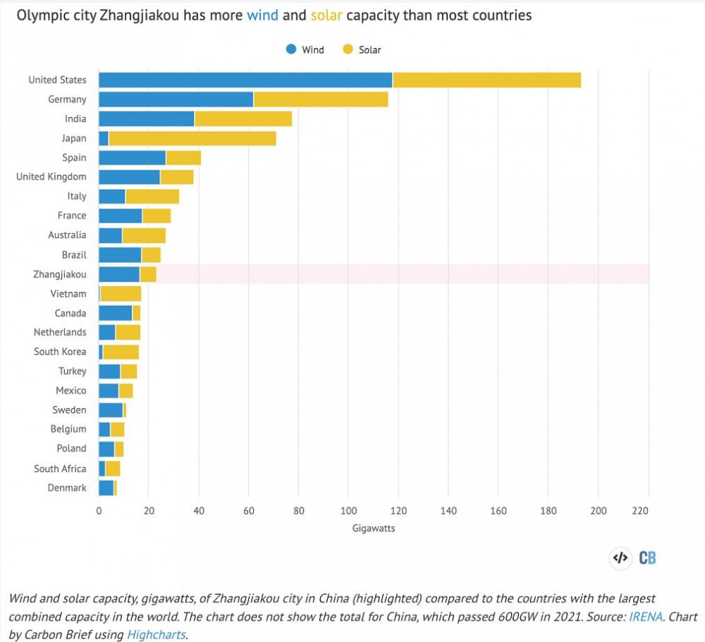 國家電網(wǎng)北京公司為奧運(yùn)會管理可再生能源電力交易。這些電力主要來自張家口的11家風(fēng)能和太陽能發(fā)電公司,冬奧會加快了張北可再生能源柔性直流電網(wǎng)的建設(shè)。北京2022年奧運(yùn)會依靠張家口市新建的基礎(chǔ)設(shè)施,這是一個耗資20億美元的項(xiàng)目,于2020年6月啟動,用于分配風(fēng)能和太陽能,并通過抽水蓄能來調(diào)節(jié)產(chǎn)出的變化。張家口的風(fēng)電和太陽能裝機(jī)也有所加快,裝機(jī)容量達(dá)到 23.4GW,包括 16.4GW 風(fēng)電和 7.0GW 太陽能。如果張家口是一個國家,它的風(fēng)能和太陽能總裝機(jī)容量將排在世界第 12 位,如下圖所示,僅次于巴西,但領(lǐng)先于越南。