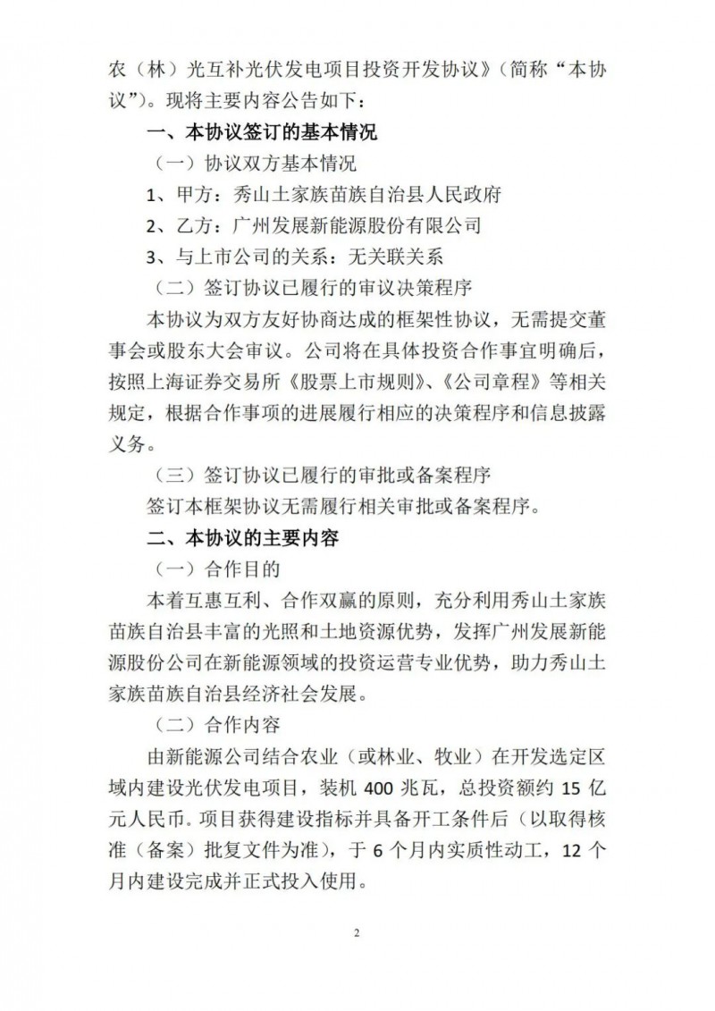 2月26日,廣州發(fā)展發(fā)布公告稱,其全資子公司廣州發(fā)展新能源股份有限公司與與重慶市秀山土家族苗族自治縣人民政府簽署《秀山土家族苗族自治縣400MW農(nóng)(林)光互補(bǔ)光伏發(fā)電項(xiàng)目投資開發(fā)協(xié)議》。