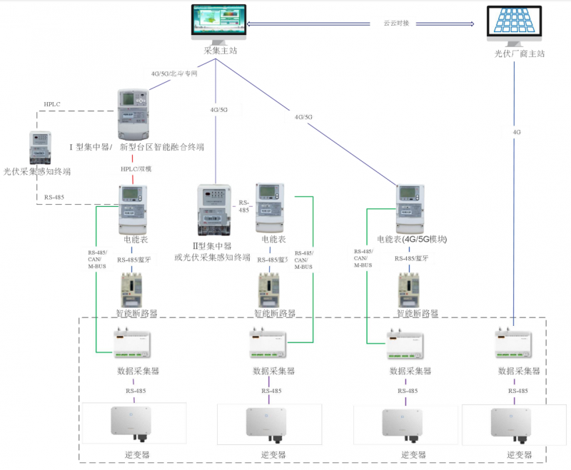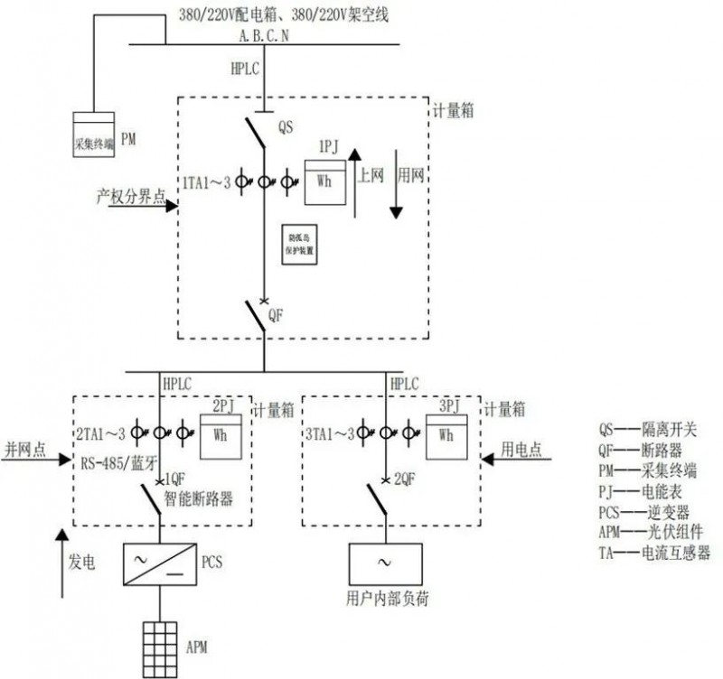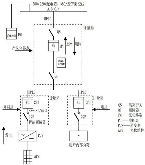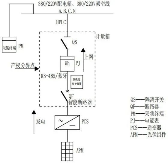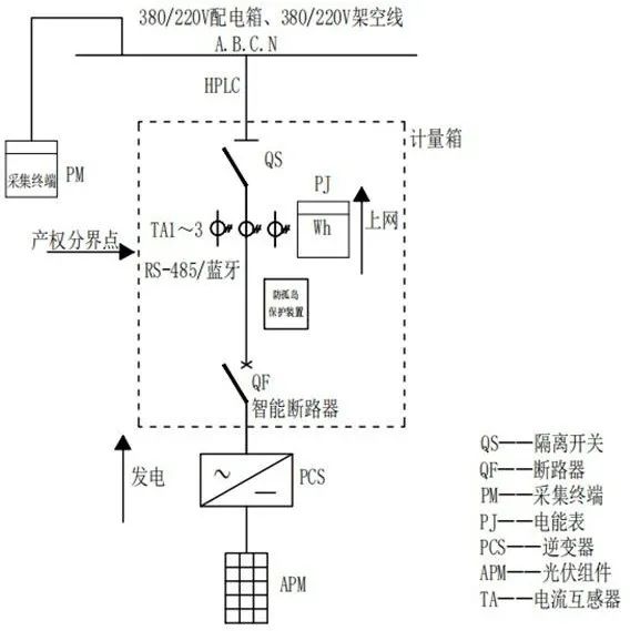 要實現(xiàn)上述目標,低壓分布式光伏計量采集需要安裝的主要設(shè)備包括:采集終端、智能電能表、電流互感器、智能斷路器、防/反孤島保護裝置等
