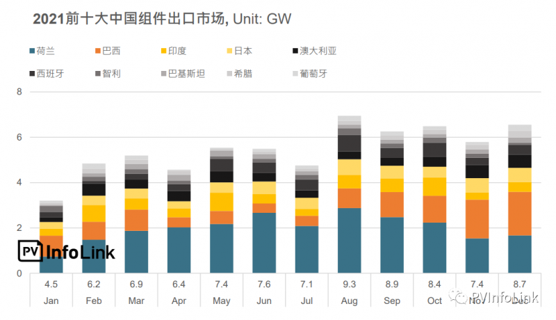 中國2021年出口了40.9GW的組件到歐洲市場,相較前一年的26.7GW同比成長了54%。受惠于能源轉(zhuǎn)型趨勢,歐洲持續(xù)維持最大的組件進(jìn)口市場,全球占比46%。主要的國家包括了荷蘭、西班牙、希臘、葡萄牙、波蘭和德國,都達(dá)到了GW級(jí)以上的進(jìn)口量,其中荷蘭為中國的第一大出口國,全年總量來到了23.8GW。但是在十一月時(shí),受到了歐洲法院專利判決的影響,部分廠家無法銷售受影響產(chǎn)品,進(jìn)口量快速下滑。
