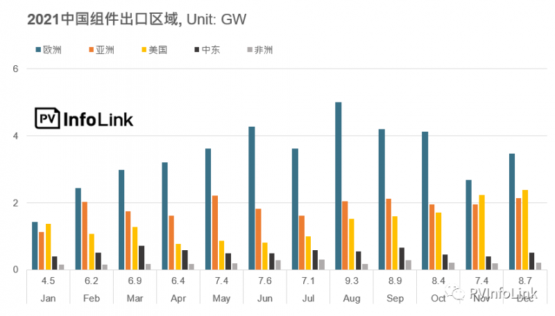 亞洲市場是從23.3GW微幅下降到22.4GW,2021全年占比下降為25%,但仍是中國組件出口的第二大市場,GW級(jí)進(jìn)口國包括印度、日本、澳大利亞和泰國,韓國與馬來西亞也有接近1GW的進(jìn)口量。2020年亞洲從中國進(jìn)口最多組件的越南則是在補(bǔ)貼政策結(jié)束后進(jìn)口量快速減少,從原本的最大進(jìn)口國下降到僅有0.4GW的進(jìn)口量。