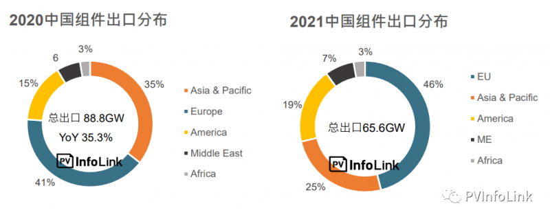 2021光伏產(chǎn)業(yè)面臨動(dòng)蕩的一年,歷經(jīng)了多晶硅暴漲,以及中國的能耗管控政策,供應(yīng)鏈價(jià)格劇烈波動(dòng),但全球光伏裝機(jī)仍是繳出了優(yōu)異的成績。根據(jù)PV Infolink統(tǒng)計(jì),2021年的全球光伏新增裝機(jī)容量達(dá)到172.6 GW,同比成長23.1%,其中,非中國市場的裝機(jī)量來到了124.6GW,同比成長了30.1%。海外需求的快速成長也帶動(dòng)了中國光伏組件的出口,根據(jù)PV Infolink統(tǒng)計(jì)中國海關(guān)出口資料,中國在2021出口組件總量來到了88.8GW,同比增長了35.3%。主要的成長來源仍是歐洲、巴西和印度等主要光伏市場。