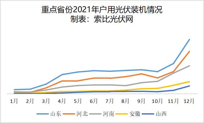 從2021年各省戶用光伏裝機規(guī)??矗綎|、河北、河南依然是最核心的三個主力市場,安徽、山西、江西、福建、江蘇等5個省也實現(xiàn)了裝機超400MW、占比超2%的目標。