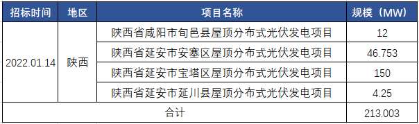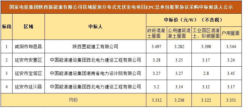 3月2日,國家電投集團陜西新能源有限公司縣域屋頂分布式光伏發(fā)電項目EPC總承包框架協(xié)議采購中標(biāo)候選人公示。項目合計規(guī)模為213MW,陜西置能建工有限公司中標(biāo)咸陽市旬邑縣12MW屋頂分布式項目,中能建三個子公司中標(biāo)剩余201MW項目。所有項目均價為3.26元/W。
