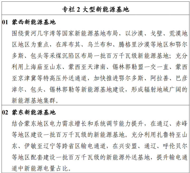 因地制宜推進(jìn)太陽(yáng)能熱發(fā)電發(fā)展??偨Y(jié)首批太陽(yáng)能熱發(fā)電示范項(xiàng)目建設(shè)經(jīng)驗(yàn),發(fā)揮太陽(yáng)能熱發(fā)電儲(chǔ)能調(diào)節(jié)能力和系統(tǒng)支撐能力,因地制宜建設(shè)太陽(yáng)能熱發(fā)電項(xiàng)目。充分發(fā)揮太陽(yáng)能熱發(fā)電在電力系統(tǒng)中調(diào)峰、調(diào)頻、儲(chǔ)能等多元功能,統(tǒng) 籌推動(dòng)太陽(yáng)能熱發(fā)電與風(fēng)電光伏基地一體化建設(shè)運(yùn)行,為新能源高比例自用和外送提供支撐,力爭(zhēng)“十四五”期間新增并網(wǎng)太陽(yáng)能熱發(fā)電項(xiàng)目 50 萬(wàn)千瓦。加快推進(jìn)新型儲(chǔ)能技術(shù)規(guī)?;瘧?yīng)用。探索采用自建、合建、租賃和共享等多元化模式,加快推動(dòng)新型儲(chǔ)能在發(fā)電側(cè)、 電網(wǎng)側(cè)、用戶側(cè)的規(guī)?;瘧?yīng)用,實(shí)現(xiàn)新能源與新型儲(chǔ)能的協(xié)同發(fā)展,原則上新建新能源項(xiàng)目要配置 15%(2 小時(shí))以上的儲(chǔ)能設(shè)施。研究出臺(tái)存量新能源項(xiàng)目增配儲(chǔ)能的管理辦法,推動(dòng)已并網(wǎng)的新能源項(xiàng)目增配儲(chǔ)能設(shè)施,提高消納和調(diào)峰能力。在充分發(fā)揮電力外送通道配套火電機(jī)組深度調(diào)峰能力的基礎(chǔ)上,合理規(guī)劃建設(shè)送端配套新型儲(chǔ)能設(shè)施,支撐大規(guī)模風(fēng)、光等可再生能源電源接入,提升外送通道可再生能源電量占比。二、充分提升可再生能源就地消納水平加快配套電網(wǎng)建設(shè)。優(yōu)化升級(jí)電網(wǎng)主網(wǎng)架,解決電網(wǎng)結(jié)構(gòu)性問(wèn)題,提升電力互濟(jì)能力,提高電網(wǎng)運(yùn)行效率和安全穩(wěn)定水平。加快推動(dòng)新能源送出工程建設(shè),滿足新能源大規(guī)模開(kāi)發(fā)的匯集與送出需求。推動(dòng)配電網(wǎng)擴(kuò)容改造和智能化升 級(jí),提升配電網(wǎng)柔性開(kāi)放接入能力、靈活控制能力和抗擾動(dòng)能力,增加電網(wǎng)就地就近平衡能力,構(gòu)建適應(yīng)分布式可再生能源并網(wǎng)和多元負(fù)荷需要的智能配電網(wǎng)。提升系統(tǒng)調(diào)節(jié)能力。積極推進(jìn)煤電靈活性改造,推動(dòng)自備電廠主動(dòng)參與調(diào)峰,加快建設(shè)天然氣調(diào)峰電站,充分提升系統(tǒng)調(diào)節(jié)能力。優(yōu)化電力調(diào)度運(yùn)行,合理安排系統(tǒng)開(kāi)機(jī)方式, 動(dòng)態(tài)調(diào)整各類電源發(fā)電計(jì)劃,探索推進(jìn)多種電源聯(lián)合調(diào)度。創(chuàng)新調(diào)度運(yùn)行與市場(chǎng)機(jī)制,促進(jìn)可再生能源在省級(jí)電網(wǎng)內(nèi)就地消納。三、穩(wěn)步有序推動(dòng)可再生能源外送消納充分發(fā)揮自治區(qū)可再生能源資源優(yōu)勢(shì)和區(qū)位優(yōu)勢(shì),按照提升一批、投產(chǎn)一批、開(kāi)工一批的發(fā)展思路,努力提高輸電 通道中新能源電量的占比,提高特高壓輸電通道利用率,大力提升可再生能源外送消納能力,有序推動(dòng)國(guó)家級(jí)新能源電力供應(yīng)保障基地建設(shè),助力全國(guó)碳達(dá)峰碳中和。“十四五” 期間,規(guī)劃新增新能源外送基地 2900 萬(wàn)千瓦,力爭(zhēng)累計(jì)投產(chǎn) 3900 萬(wàn)千瓦。加快推動(dòng)已批復(fù)新能源外送基地投產(chǎn)運(yùn)行。加快推動(dòng)錫林郭勒盟“一交一直”一期、上海廟至山東一期、扎魯特至青州特高壓輸電通道配套新能源基地、烏蘭察布風(fēng)電基地等已批復(fù)新能源基地建設(shè)進(jìn)度,力爭(zhēng) 2025 年前建成投產(chǎn) 1500 萬(wàn)千瓦左右。提升既有外送通道中新能源電量占比。提高自治區(qū)可再生能源外送規(guī)模,在蒙西至天津南交流特高壓、上海廟至山 東直流特高壓、錫林郭勒盟交直流特高壓等既有特高壓外送 輸電通道以及傳統(tǒng)火電廠外送專線基礎(chǔ)上,統(tǒng)籌送端周邊地區(qū)資源條件和環(huán)境約束,合理優(yōu)化風(fēng)能、太陽(yáng)能資源配置方 案,增配布局一批新能源基地,大幅提高存量外送輸電通道中可再生能源占比和通道利用效率,“十四五”期間建成外送新能源 1900 萬(wàn)千瓦。積極推進(jìn)新建蒙西外送通道配套新能源基地開(kāi)工建設(shè)。統(tǒng)籌優(yōu)化蒙西地區(qū)風(fēng)能、太陽(yáng)能資源和接入條件,在資源稟賦較好、開(kāi)發(fā)建設(shè)條件優(yōu)越、具備持續(xù)整裝開(kāi)發(fā)條件的地區(qū), 推進(jìn)風(fēng)能、太陽(yáng)能、煤炭等多能互補(bǔ)發(fā)展,有序建設(shè)一批百萬(wàn)千瓦級(jí)新能源基地,實(shí)現(xiàn)高比例可再生能源外送,力爭(zhēng)2025 年前推動(dòng)開(kāi)工配套新能源基地 1000 萬(wàn)千瓦。