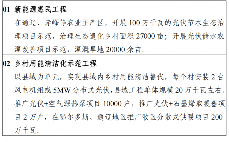 五、加快推動(dòng)農(nóng)村能源革命助力鄉(xiāng)村振興新能源惠民工程。開(kāi)展農(nóng)網(wǎng)鞏固提升工程,與提升風(fēng)電、光伏等分布式電能就近接入有機(jī)結(jié)合,提升鄉(xiāng)村電氣化水平,提高農(nóng)電服務(wù)水平,推進(jìn)農(nóng)網(wǎng)智能化。在電網(wǎng)基礎(chǔ)建設(shè)薄弱且用電負(fù)荷分散度較高的偏遠(yuǎn)末端配電網(wǎng)、農(nóng)區(qū)牧區(qū)等地區(qū),因地制宜推動(dòng)風(fēng)電、光伏開(kāi)發(fā)。在通遼、赤峰等盟市, 開(kāi)展光伏儲(chǔ)水農(nóng)灌改善工程和光伏節(jié)水生態(tài)治理工程示范, 提升電網(wǎng)農(nóng)灌期供電可靠性,構(gòu)建新型節(jié)水灌溉系統(tǒng),有效實(shí)現(xiàn)節(jié)水節(jié)能、生態(tài)恢復(fù)治理。自治區(qū)鄉(xiāng)村人口約 960 萬(wàn)人,開(kāi)展 100 萬(wàn)千瓦新能源惠民工程,滿足農(nóng)村牧區(qū)清潔用能需求。鄉(xiāng)村用能清潔化示范工程。推動(dòng)鄉(xiāng)村產(chǎn)業(yè)、農(nóng)業(yè)生產(chǎn)和農(nóng)村生活用能清潔化,以分布式光伏、分散式風(fēng)電、地?zé)崮芾脼楹诵?,開(kāi)展智慧用能大棚、清潔供暖、綠色出行等智慧用能示范。加快提升呼包鄂周邊、蒙東鄉(xiāng)村可再生能源供暖水平,合理配比分散式風(fēng)電和分布式光伏,利用電熱膜、電鍋爐、空氣源熱泵、石墨烯取暖器等供暖設(shè)施,形成清潔能源支持產(chǎn)業(yè)發(fā)展、產(chǎn)業(yè)發(fā)展助力鄉(xiāng)村振興的農(nóng)村安居環(huán) 境。在通遼、鄂爾多斯等農(nóng)牧區(qū),開(kāi)展牧區(qū)清潔供暖示范項(xiàng)目,探索離網(wǎng)式新能源供電供熱模式,滿足農(nóng)村牧區(qū)清潔用能需求。在蒙東地區(qū)人口密集的旗縣,充分利用當(dāng)?shù)亟斩捹Y源開(kāi)展生物質(zhì)發(fā)電供暖示范,實(shí)現(xiàn)旗縣區(qū)域生物質(zhì)供暖規(guī)?;娲?,提升可再生能源消費(fèi)占比,推廣生物質(zhì)碳化與固化及高效低排節(jié)能爐具。