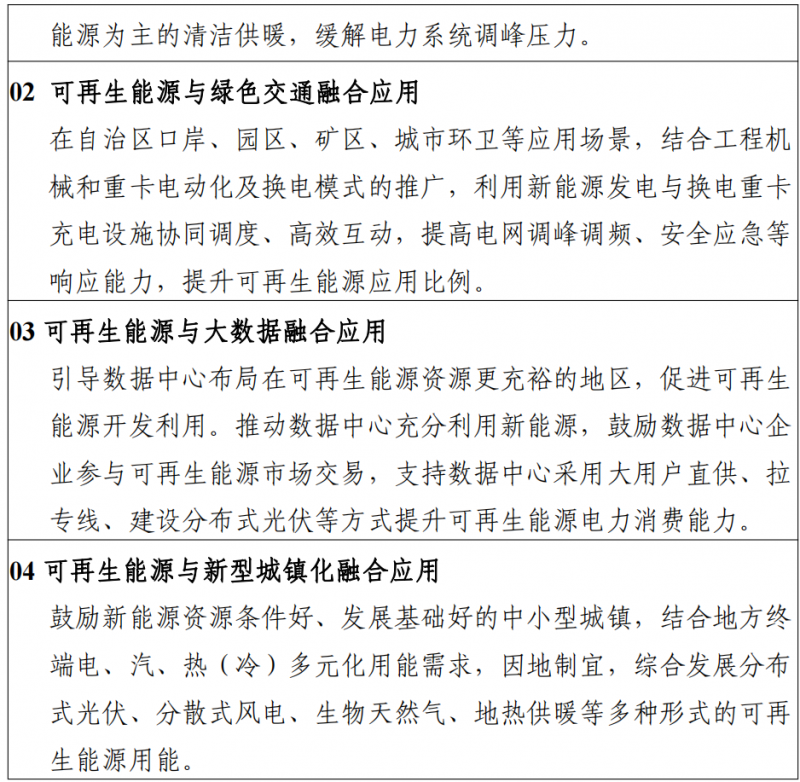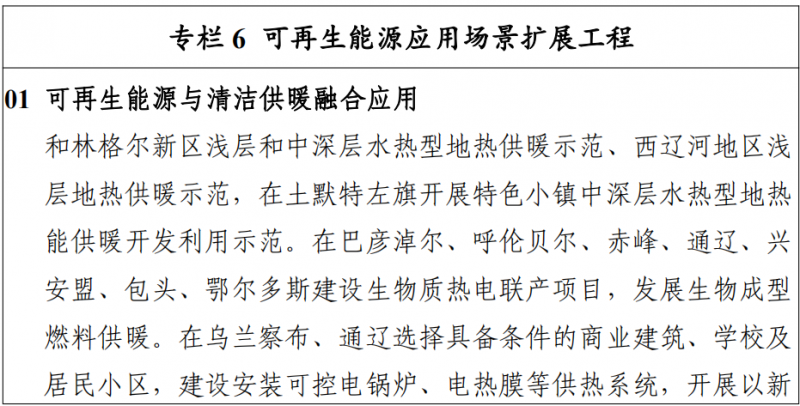 四、廣泛擴(kuò)展可再生能源應(yīng)用場(chǎng)景實(shí)施火電靈活性改造。加快存量煤電改造升級(jí),推廣深度調(diào)峰技術(shù)應(yīng)用,積極推進(jìn)現(xiàn)役煤電機(jī)組實(shí)施靈活性改造, 鼓勵(lì)新建煤電機(jī)組靈活性制造,降低新建煤電機(jī)組最小技術(shù)出力水平,提升電力系統(tǒng)整體消納能力,促進(jìn)新能源大規(guī)模開(kāi)發(fā)和高效利用,引導(dǎo)煤電由主力電源逐步向“支撐型”、“調(diào) 節(jié)型”電源轉(zhuǎn)變。推進(jìn)工業(yè)園區(qū)可再生替代。充分挖掘燃煤自備電廠園區(qū)的電源靈活調(diào)節(jié)能力和負(fù)荷側(cè)需求響應(yīng)能力,推動(dòng)園區(qū)自備電廠參與調(diào)峰,改變單一依靠自備火電的傳統(tǒng)供能方式,因地制宜推動(dòng)風(fēng)電、光伏建設(shè),鼓勵(lì)集中式與分布式并舉,在 不占用公共電網(wǎng)的消納空間且保證用能安全的前提下實(shí)現(xiàn) 新能源全額自發(fā)自用,逐步實(shí)現(xiàn)園區(qū)用能清潔化。開(kāi)展低碳工業(yè)園區(qū)示范。鼓勵(lì)具備新增負(fù)荷的園區(qū)開(kāi)展低碳工業(yè)園示范項(xiàng)目,以近零碳用能為目標(biāo),率先開(kāi)展全清潔能源供電,提升園區(qū)整體能效。通過(guò)自建分布式、新能源專線供電、綠色電力交易、綠證交易等多種方式,實(shí)現(xiàn)園區(qū)新增用電需求主要由新能源滿足。同時(shí),鼓勵(lì)園區(qū)通過(guò)配置儲(chǔ)能等措施,保證與園區(qū)負(fù)荷的匹配響應(yīng)和高比例自平衡, 不占用公共電網(wǎng)消納空間。推廣“綠電+綠氫”發(fā)展新模式。鼓勵(lì)采用具有適應(yīng)可再生能源出力波動(dòng)的綠色制氫技術(shù),加快推進(jìn)風(fēng)光氫儲(chǔ)一體化示范,推廣氫燃料電池汽車在礦山、物流、公交等領(lǐng)域的規(guī)?;瘧?yīng)用,積極探索氫能在冶金、化工、交通等領(lǐng)域的應(yīng)用。開(kāi)展源網(wǎng)荷儲(chǔ)一體化示范。充分挖掘和釋放生產(chǎn)側(cè)、消費(fèi)側(cè)調(diào)節(jié)能力,最大化發(fā)揮負(fù)荷側(cè)調(diào)節(jié)響應(yīng)能力,就近合理配套新能源,加強(qiáng)源網(wǎng)荷儲(chǔ)多向互動(dòng),通過(guò)電價(jià)優(yōu)勢(shì)帶動(dòng)儲(chǔ)能、大數(shù)據(jù)、新能源、新材料等行業(yè)全產(chǎn)業(yè)鏈發(fā)展。加快烏蘭察布、通遼源網(wǎng)荷儲(chǔ)一體化示范工程建設(shè),提升本地電源支撐,有效緩解供電缺口,推動(dòng)局部新能源就近消納,不占用公共電網(wǎng)調(diào)峰和消納空間,提升新能源開(kāi)發(fā)利用水平。持續(xù)推廣可再生能源清潔供暖。發(fā)揮自治區(qū)風(fēng)能、光伏、農(nóng)林、地?zé)豳Y源優(yōu)勢(shì),建立多元化可再生能源清潔供暖體系, 促進(jìn)環(huán)境質(zhì)量和人民生活條件改善。在呼包鄂城市群積極推動(dòng)中深層地?zé)崮芤?guī)?;┡痉?,創(chuàng)新城市用能新模式。在蒙東地區(qū)發(fā)展生物質(zhì)熱電聯(lián)產(chǎn)項(xiàng)目,探索以農(nóng)林生物質(zhì)、生物質(zhì)成型燃料等為燃料的生物質(zhì)鍋爐供熱方式,有效保護(hù)城鄉(xiāng)環(huán)境。在呼和浩特、包頭、烏蘭察布、通遼等地,開(kāi)展清潔電供暖示范。大力發(fā)展以新能源為主的綜合能源應(yīng)用。結(jié)合配電網(wǎng)、燃?xì)饩W(wǎng)、熱力網(wǎng)等能源網(wǎng)絡(luò),綜合可再生能源、儲(chǔ)能、信息通訊等先進(jìn)技術(shù),推動(dòng)分布式可再生能源高效靈活接入與生產(chǎn)消費(fèi)一體化,建設(shè)冷熱水電氣供應(yīng)的區(qū)域綜合能源系統(tǒng)。