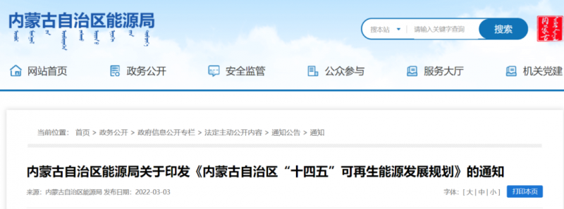 2022年3月2日,內(nèi)蒙古自治區(qū)能源局關(guān)于印發(fā)《內(nèi)蒙古自治區(qū)“十四五”可再生能源發(fā)展規(guī)劃》,提出:"十四五"末,內(nèi)蒙古可再生能源發(fā)電裝機(jī)達(dá)到 1.35 億千瓦以上,其中風(fēng)電 8900 萬(wàn)千瓦、光伏發(fā)電 4500 萬(wàn)千瓦,相當(dāng)于新增風(fēng)電項(xiàng)目5115萬(wàn)千瓦,光伏項(xiàng)目3262萬(wàn)千瓦,共8377萬(wàn)千瓦,包含本地消納和外送兩類。平均利用率保持在 90%以上。同時(shí),將依據(jù)國(guó)土空間規(guī)劃,完善可再生能源空間用途管制規(guī)則,保障可再生能源開(kāi)發(fā)利用合理的用地空間需求。落實(shí)草原林地征占用分區(qū)管控政策,保障可再生能源項(xiàng)目使用草原林地需求。規(guī)范土地性質(zhì)認(rèn)定,明確林草等不同地類的用地標(biāo)準(zhǔn)。