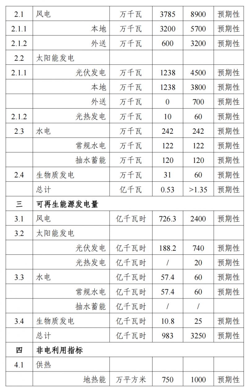 “十四五”時(shí)期主要發(fā)展目標(biāo)如下:——可再生能源總量目標(biāo)。2025 年,自治區(qū)可再生能源供給能力顯著提高,可再生能源生產(chǎn)總量超過(guò) 9000 萬(wàn)噸標(biāo)準(zhǔn)煤,可再生能源區(qū)內(nèi)利用量超過(guò) 6000 萬(wàn)噸標(biāo)準(zhǔn)煤,占當(dāng)年一次能源消費(fèi)總量的 18%以上,超過(guò)全國(guó)平均水平。——可再生能源發(fā)電目標(biāo)。自治區(qū)可再生能源發(fā)電裝機(jī)達(dá)到 1.35 億千瓦以上,其中風(fēng)電 8900 萬(wàn)千瓦、光伏發(fā)電 4500 萬(wàn)千瓦,新能源裝機(jī)規(guī)模超過(guò)燃煤火電裝機(jī)規(guī)模,新能源發(fā)電量占自治區(qū)總發(fā)電量比重超過(guò) 35%。“十四五”期間可再生能源新增裝機(jī) 8000 萬(wàn)千瓦以上,占全部新增裝機(jī)的比重超過(guò) 60%,成為新增裝機(jī)的主力。——可再生能源并網(wǎng)運(yùn)行目標(biāo)。全區(qū)可再生能源在更大 規(guī)模發(fā)展的情況下實(shí)現(xiàn)合理利用,平均利用率保持在 90%以上,可再生能源發(fā)電能力持續(xù)提升并領(lǐng)先全國(guó)。