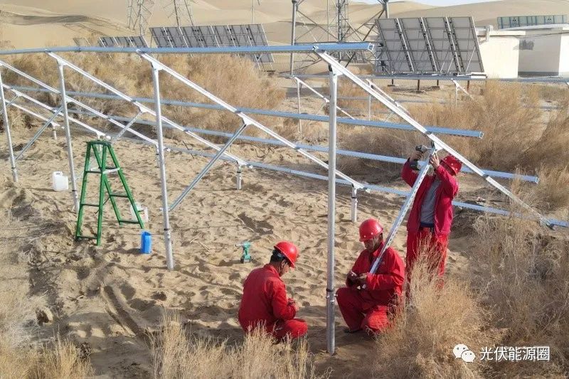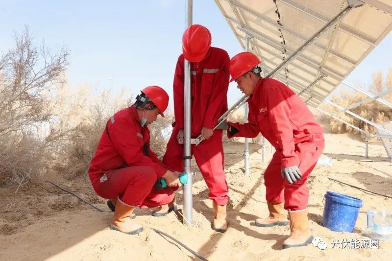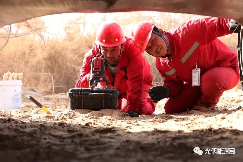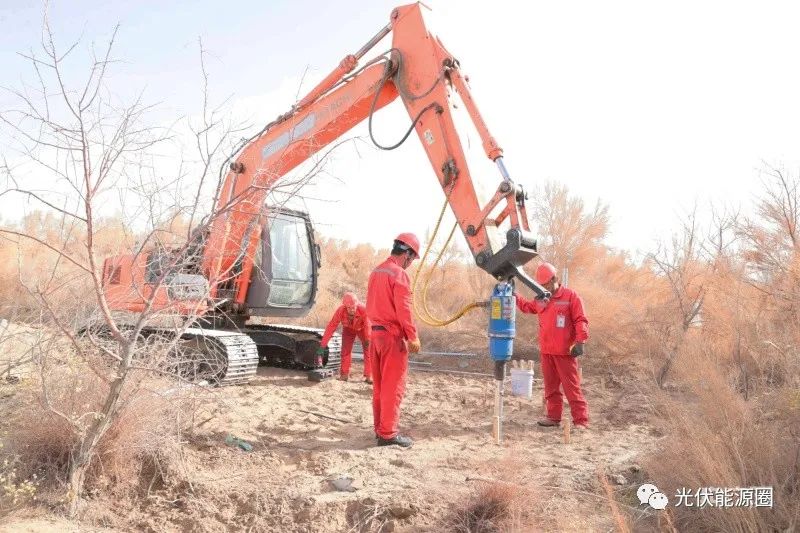 在18號水井房,記者看到,組長李強正帶著三名工人給平整的場地打螺旋樁基礎(chǔ),為了保證后續(xù)安裝質(zhì)量,他們用激光水平儀、木樁、線繩在高低不平的沙地上找出水平線,然后用改裝的挖掘機將2.2米的螺旋樁按點位旋轉(zhuǎn)壓入地基。在挖掘機轟隆隆的嘶吼聲中,一個寬三米、長16.8米的安裝面20多分鐘就完成了。
