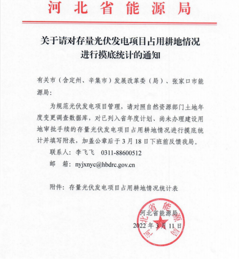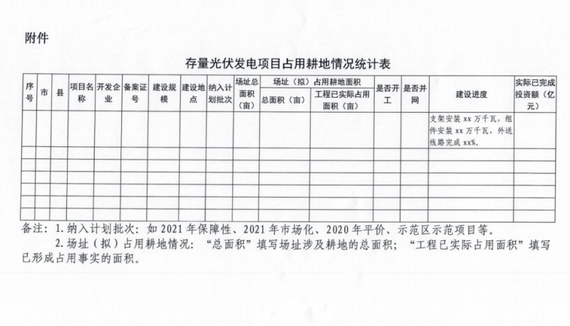 3月11日,河北省能源局啟動存量光伏電站占用耕地摸底統(tǒng)計工作,文件要求對照自然資源部門土地年度變更調查數據庫,對已列入省年度計劃、尚未辦理建設用地審批手續(xù)的存量光伏發(fā)電項目占用耕地情況進行摸底統(tǒng)計。附表信息統(tǒng)計中包括項目名稱、開發(fā)企業(yè)、備案證號、建設規(guī)模及地點、納入計劃批次以及場址總面積、已占用面積以及建設進度等多項詳細信息。